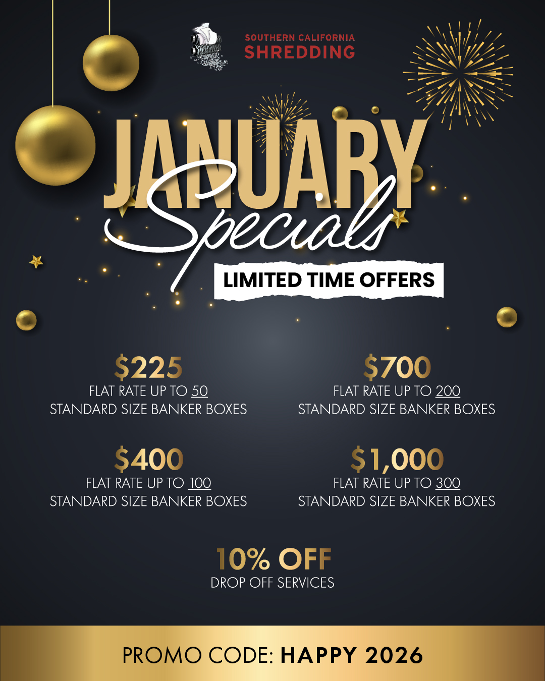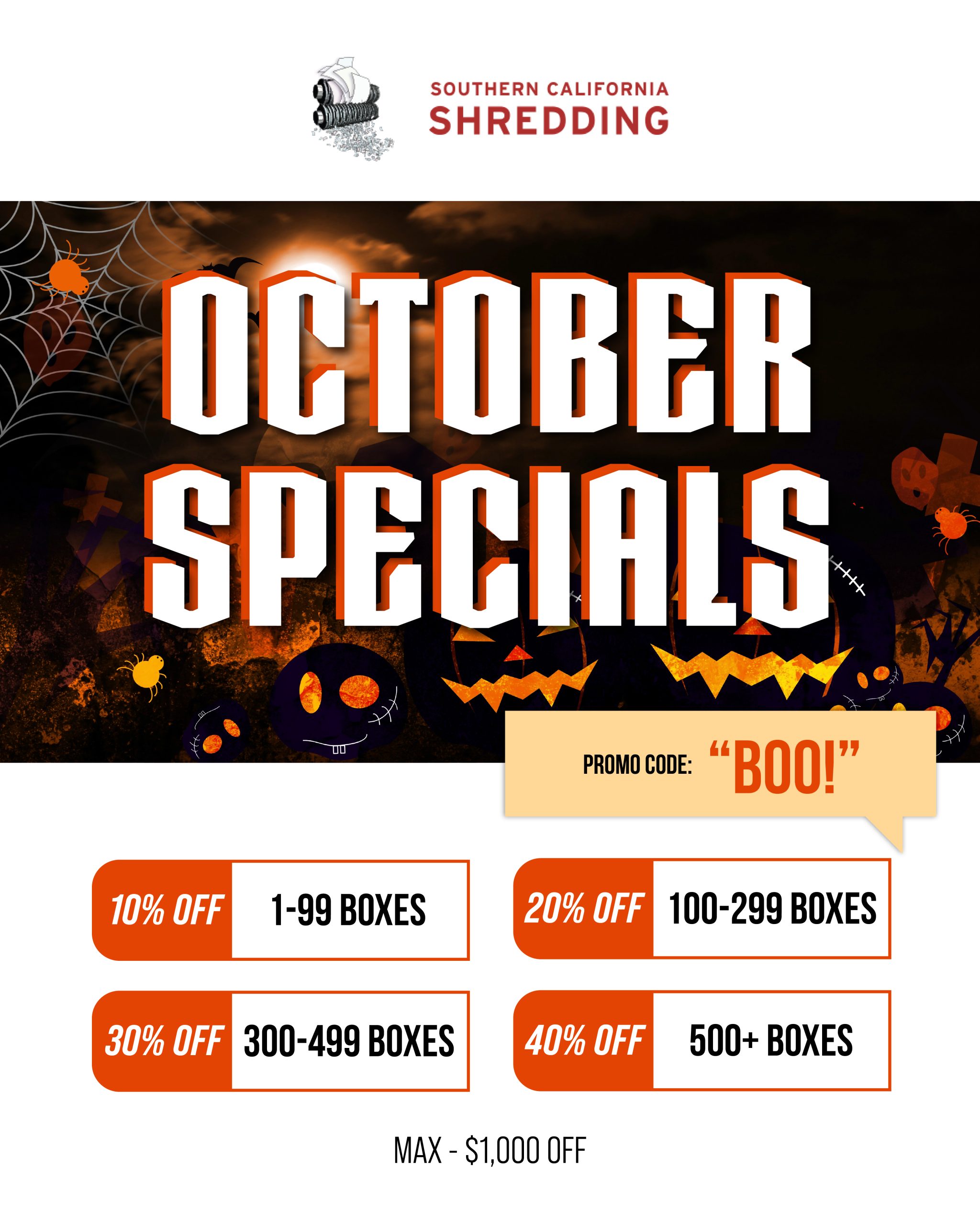 Shredding specials is one of the many ways Southern California Shredding provides effective shredding services in Orange County, Los Angeles County, San Bernardino County, Riverside County, and San Diego County. Contact us online or by calling 1.866.66SHRED to schedule your shredding services.